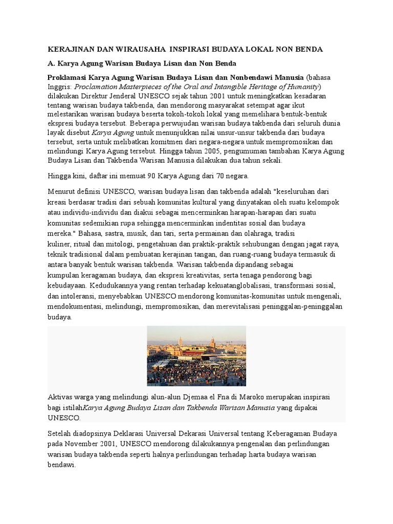 Kerajinan Dan Wirausaha Inspirasi Budaya Lokal Non Benda from imgv2-1-f.scribdassets.com Perancangan kerajinan dengan inspirasi budaya nonbenda akan menerjemahkan sesuatu yang abstrak (tak berbenda) menjadi benda (berwujud). Faktor penyebab keberhasilan dan kegagalan berwirausaha. Proklamasi karya agung warisan budaya lisan dan nonbendawi manusia (bahasa inggris: